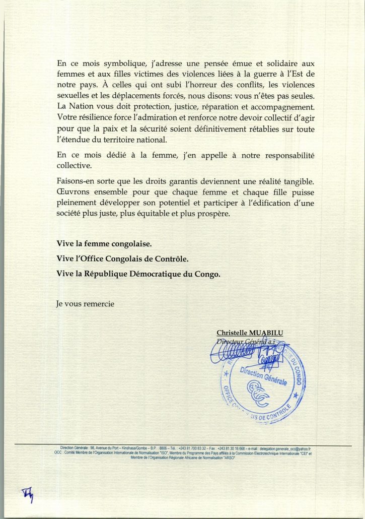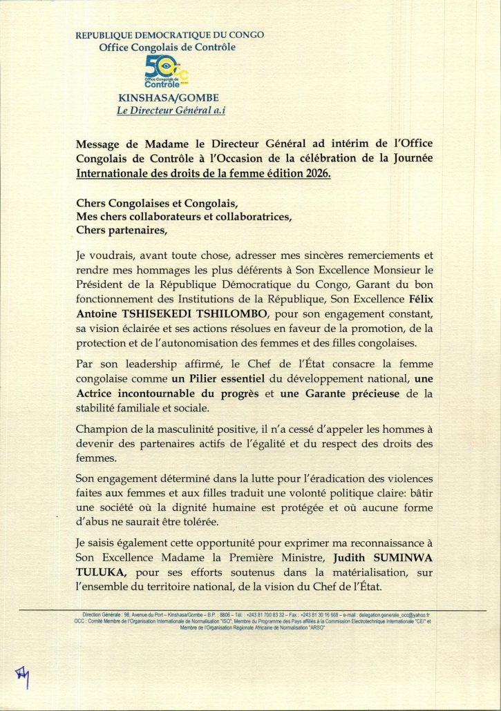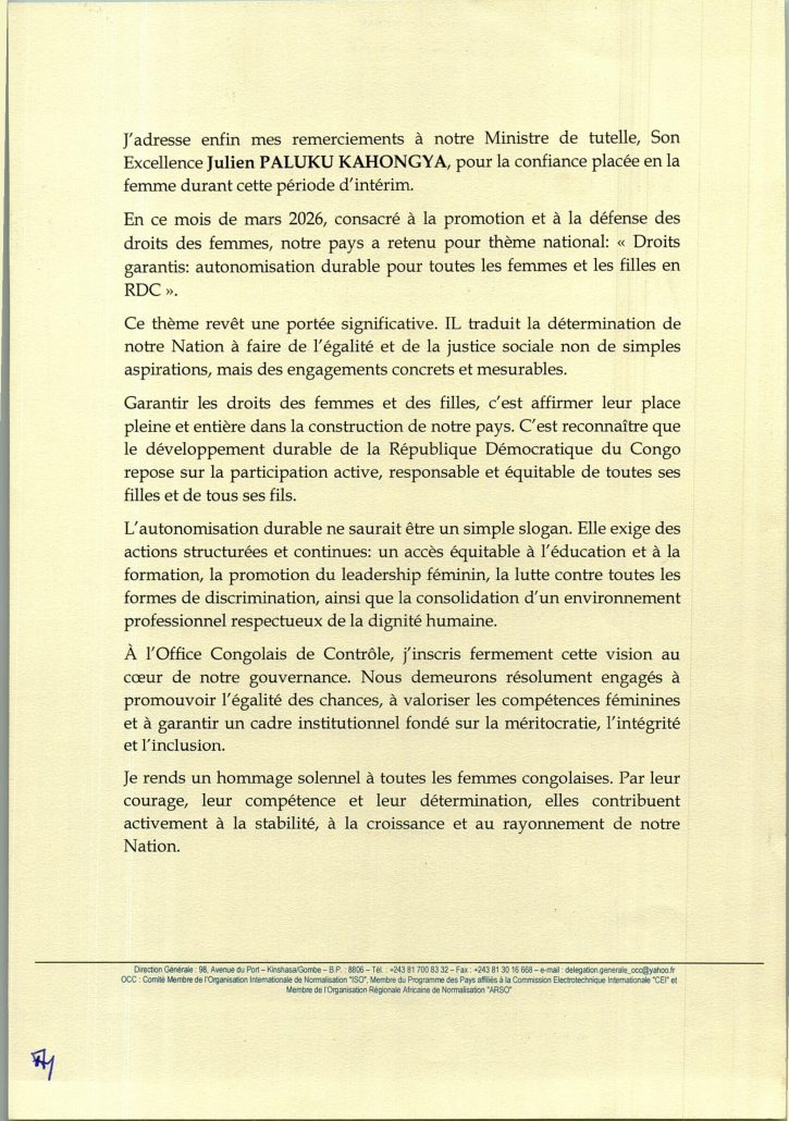 Message de Mme le Directeur Général ad intérim de l’OCC à l’occasion de la célébration de la journée internationale des droits de la femme édition 2026